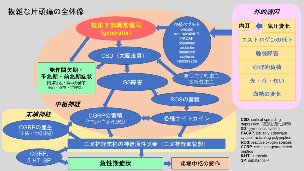 脳(中枢)での電気信号の異常が、眠気、あくび、嘔気、倦怠感、めまい、閃輝暗点などの予兆や前兆に関わり、三叉神経(末梢)での炎症が拍動性の頭痛本体に関わるとされています。