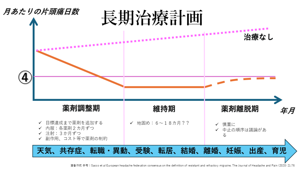 例えば2020年と2025年で治療に対する考え方は全く異なります。現時点で最適な治療を行い、最低限、片頭痛の進行や、薬物乱用頭痛への移行を回避し、目の前の生活の質を改善させましょう。